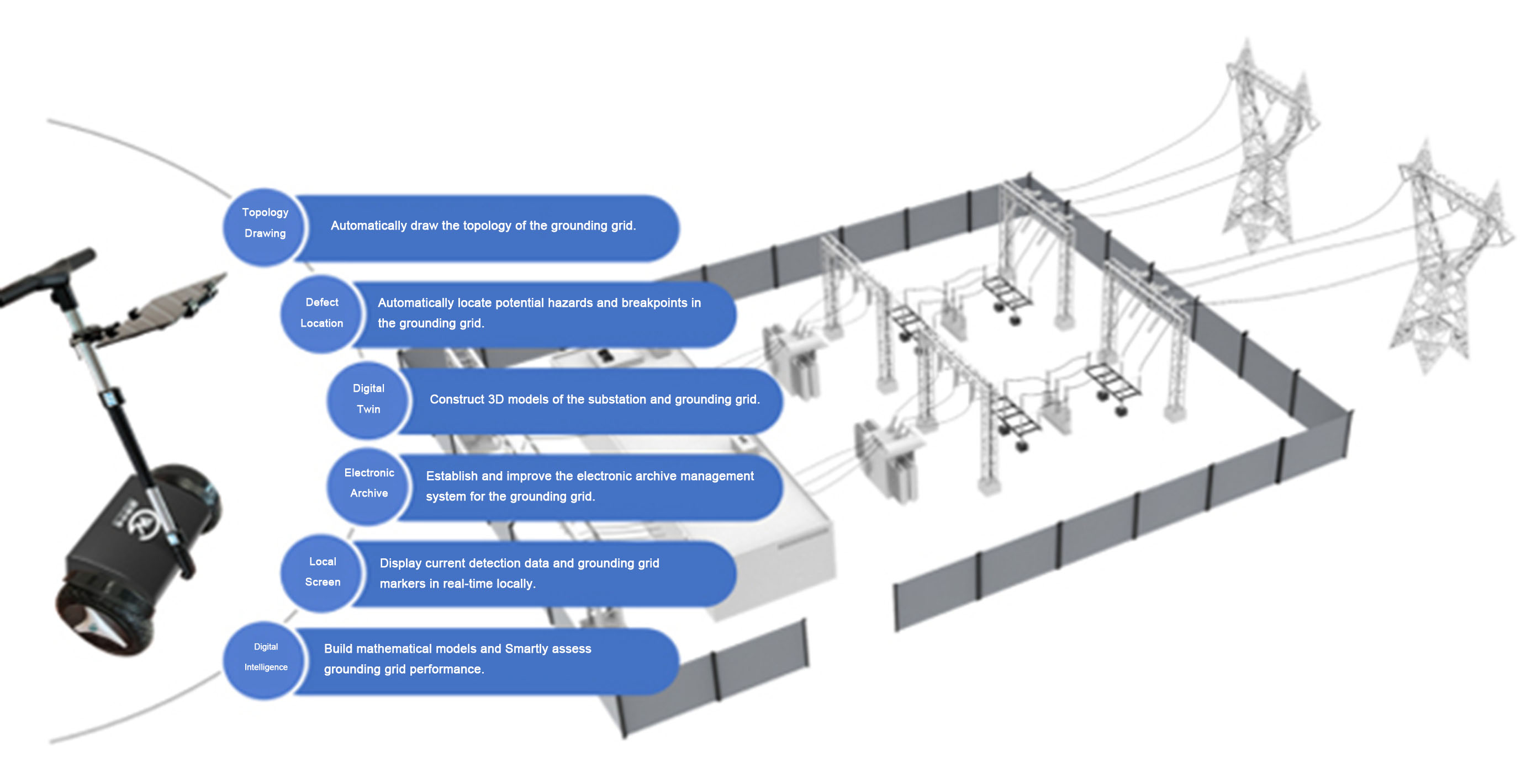 The substation grounding grid condition detection system injects variable-frequency excitation current into the grounding grid through surface grounding down conductors 众赢国际版app. It measures the induced surface magnetic flux density and coordinates, employs differential algorithm-based detection to generate topological diagrams, conducts corrosion analysis and defect localization for horizontal grounding grids, providing basis and decision-making support for on-site excavation.