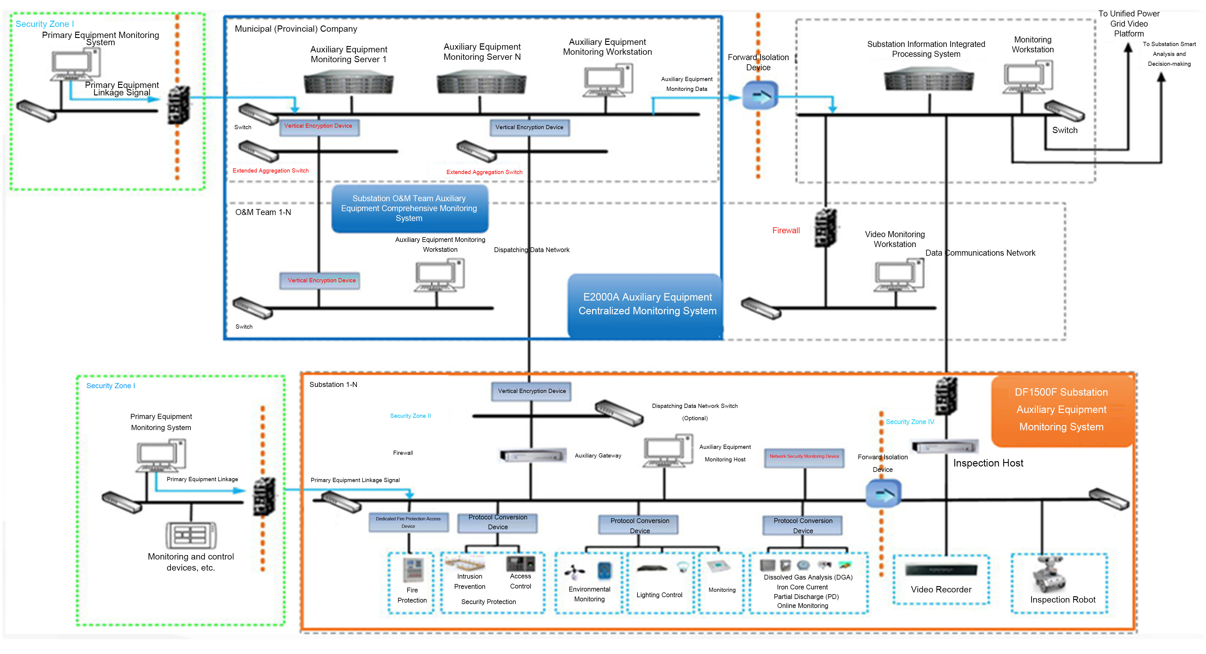 The auxiliary equipment monitoring system includes subsystems such as primary equipment online monitoring, fire protection, security defense, power environment monitoring, intelligent lock control, and intelligent inspection, achieving functions including primary equipment online monitoring, fire alarm, security guarding, power environment monitoring and control, intelligent lock control, classified storage of image monitoring information, intelligent linkage, and comprehensive display 众赢国际版app. The primary equipment online monitoring, fire protection, security defense, power environment monitoring, and intelligent lock control subsystems are deployed in Security Zone II, while the wireless sensor access and intelligent inspection subsystems are deployed in Security Zone IV. Security Zone II and Security Zone IV are interconnected through forward and reverse isolation devices.